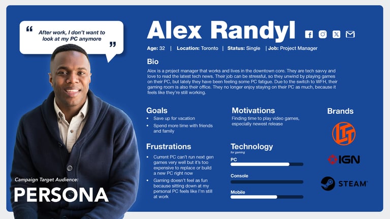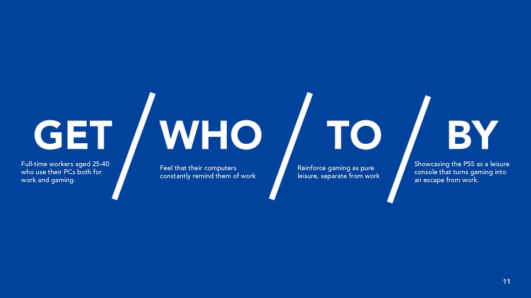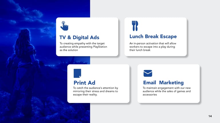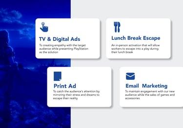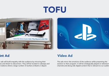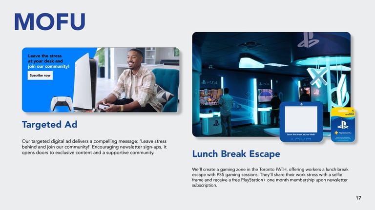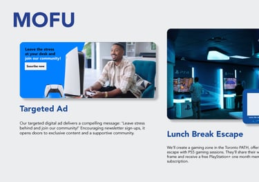 Middle of the funnel: digital ads and in-person activations that emphasize PlayStation's benefits over PC gaming for unwinding.