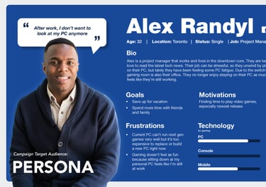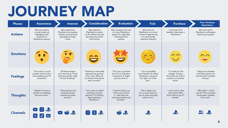 Stages of awareness, consideration, and decision, as Alex transitions from PC fatigue to discovering PlayStation's appeal.