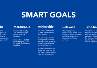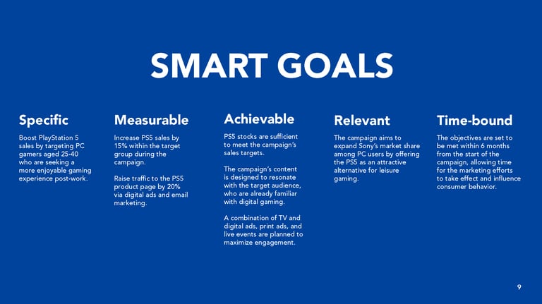 Here is our SMART goals that aim to increase PS5 sales by 15% within the target group, enhance brand engagement, and elevate PlayStation’s market share.