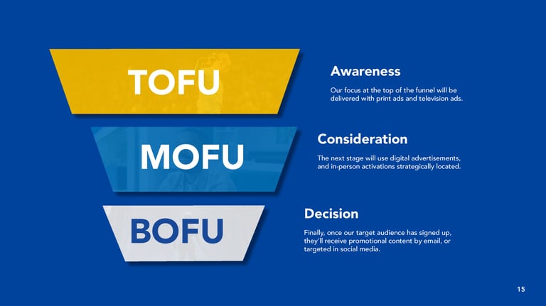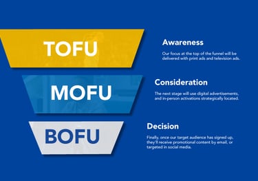 Comprehensive funnel strategy that engages consumers from awareness through purchase, using targeted ads, promotions, and community engagement.
