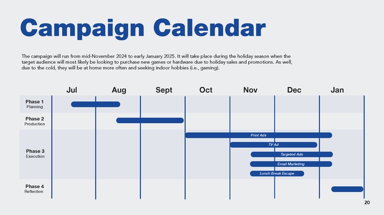Schedule of activities, promotions, and key milestones throughout the campaign's timeline.