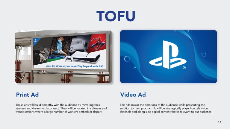 Top of the funnel: compelling print and TV ads designed to raise awareness and intrigue about PlayStation's relaxing gaming experience.